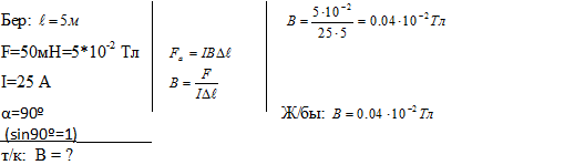 - Актив бөлігінің ұзындығы 5 см болатын өткзгішке 50 мН күшпен әсер ететін магнит өрісінің индукциясы қандай? Өткізгіштегі ток күші 25 А. Өткізгіш магнит өрісінің индукциясына перпендикуляр орналасқан.