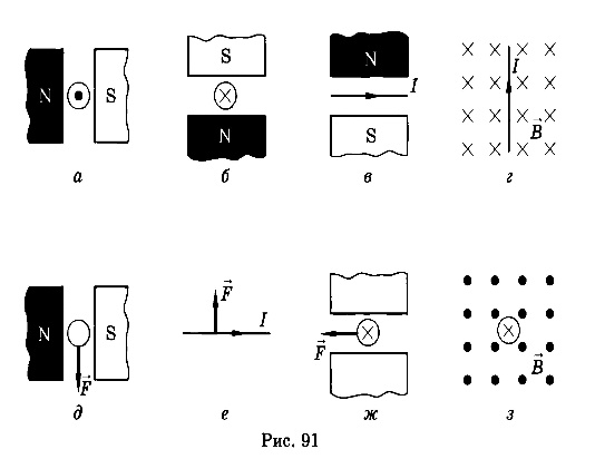 Егер магнит индукциясы мен ток күшінің бағыттары суретте көрсетілгендей болса, Ампер күшінің бағытын анықтаңдар (а-г).