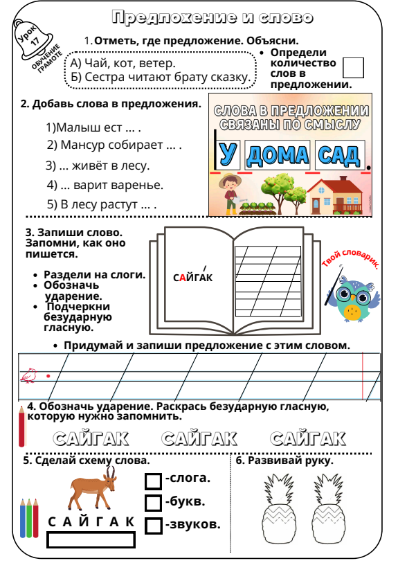Дескриптор: Составляют рассказ по картинкам. Записывают предложения Дескриптор: Рассматривают записи, определяют, где предложения Дескриптор: Узнают, как связаны слова в предложении. Дескриптор: Слушают текст, определяют его жанр (сказка, рассказ или стихотворение) Дескриптор: Находят в тексте и читают описание сайгака Дескриптор: Запоминают орфографическое написание словарного слова Дескриптор: Находят следы сайгака, доказывают это предложением из текста Дескриптор: Записывают ответы на вопросы Повторяют движения за учителем