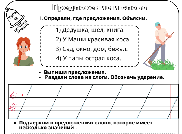 Дескриптор: Учащиеся повторяют то, что знают о предложении. Формулируют тему урока под руководством учителя, определяют цель урока Дескриптор: Записывают буквы и слова каллиграфически верно. Дескриптор: Объясняют, в чем ошибся художник Дескриптор: Записывают предложения, составляют к ним схемы Дескриптор: Узнают о то, какие значения могут иметь слова. Дескриптор: Составляют и записывают текст Отвечают на вопрос Повторяют движения за учителем