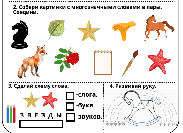 пальцем показывают траекторию 4. Работа по теме урока. (И) Самостоятельная работа. Работа в тетради на печатной основе 1. Запиши слова: экспонат, посетители, экскурсовод. 2. Раздели слова на слоги, обозначь ударение. 3. Составь звуковые схемы слов: портрет, скульптура. 4. Запиши предложения Мастерицы вышивают картины иголками. У ёжика колючие иголки. Подчеркни слова, которое имеют несколько значений. (Г) Работа в группах Игра «Однозначные – многозначные»