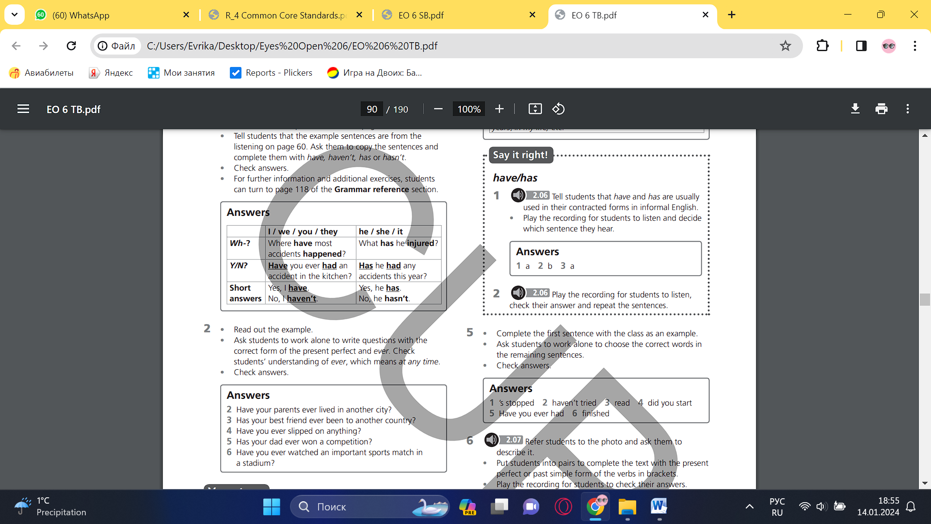 Ex: 2 P: 61 Read out the example. Ask students to work alone to write questions with the correct form of the present perfect and ever. Check students' understanding of ever, which means at any time. Check answers. Ex: 4 P: 61 Refer students to the example sentences. Put students into pairs to copy and complete the rules. Check answers Ex: 5 P: 61 Complete the first sentence with the class as an example. Ask students to work alone to choose the correct words in the remaining sentences. Check answers Ex: 6 P: 61 Refer students to the photo and ask them to describe it. Put students into pairs to complete the text with the present perfect or past simple form of the verbs in brackets. Play the recording for students to check their answers. Conclusion during the lesson some tasks differentiated by outcomes of the students and by their abilities. |