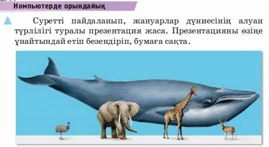 Дискриптор: -Жасалған слайдтарды тапсырады -Қандай безендірулер жасалғанын талдайды «Комментарий» арқылы бір-бірін бағалау» Дискриптор: - Суретті пайдаланып, жануарлар дүниесінің алуан түрлілігі туралы презентация жасайды -Презентацияны өзіңе ұнайтындай етіп безендіріп «Жарайсыңдар» Дискриптор: Онлайн платформада сұрақтарға жауап береді |