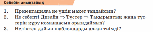 Дискриптор: -Презентация не үшін макет таңдайтынын айтады -Неліктен дайын шаблондарды алған тиімді екенін айтады Бәре келді; Керемет