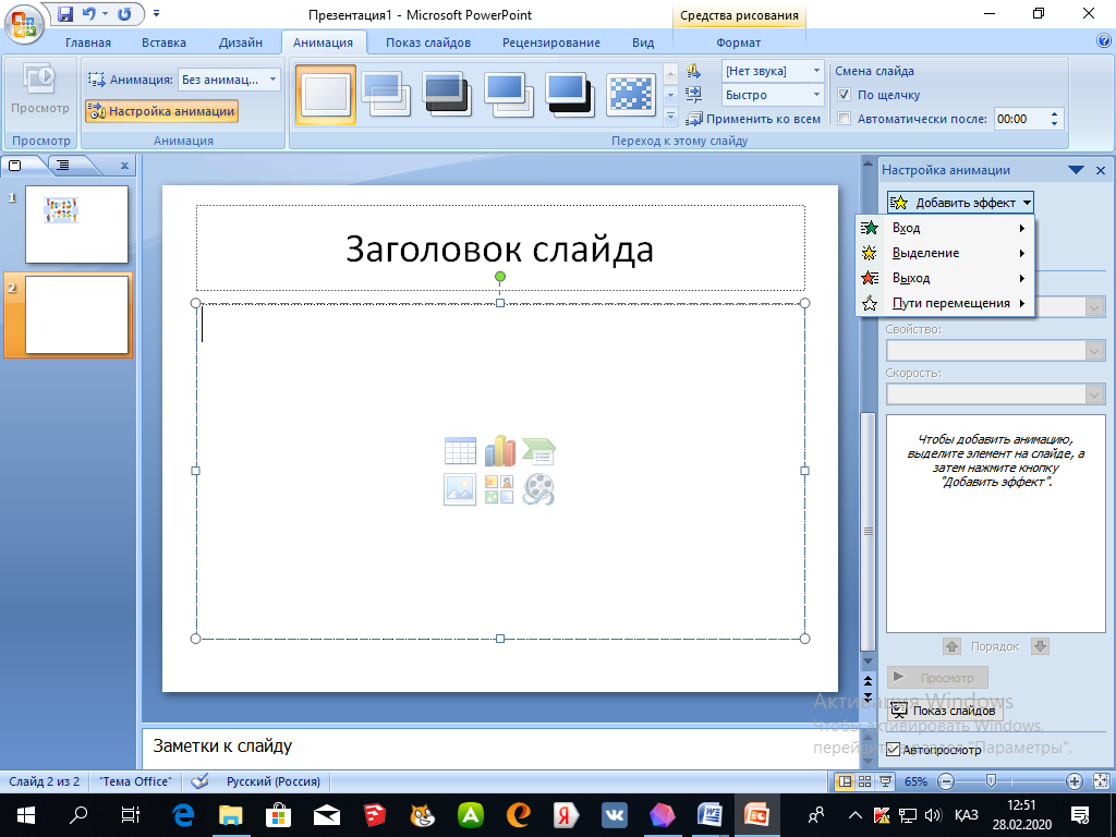 Дескриптор - Кіру әсерлері анимациясын пайдаланады. - Ерекшелеу әсерлері анимациясын пайдаланады. - Шығу әсерлері анимациясын пайдаланады. - Қозғалыс жол әсерлері анимациясын пайдаланады. Жаттығуды жасайды Оқушылар сұрақтарға жауап береді. |