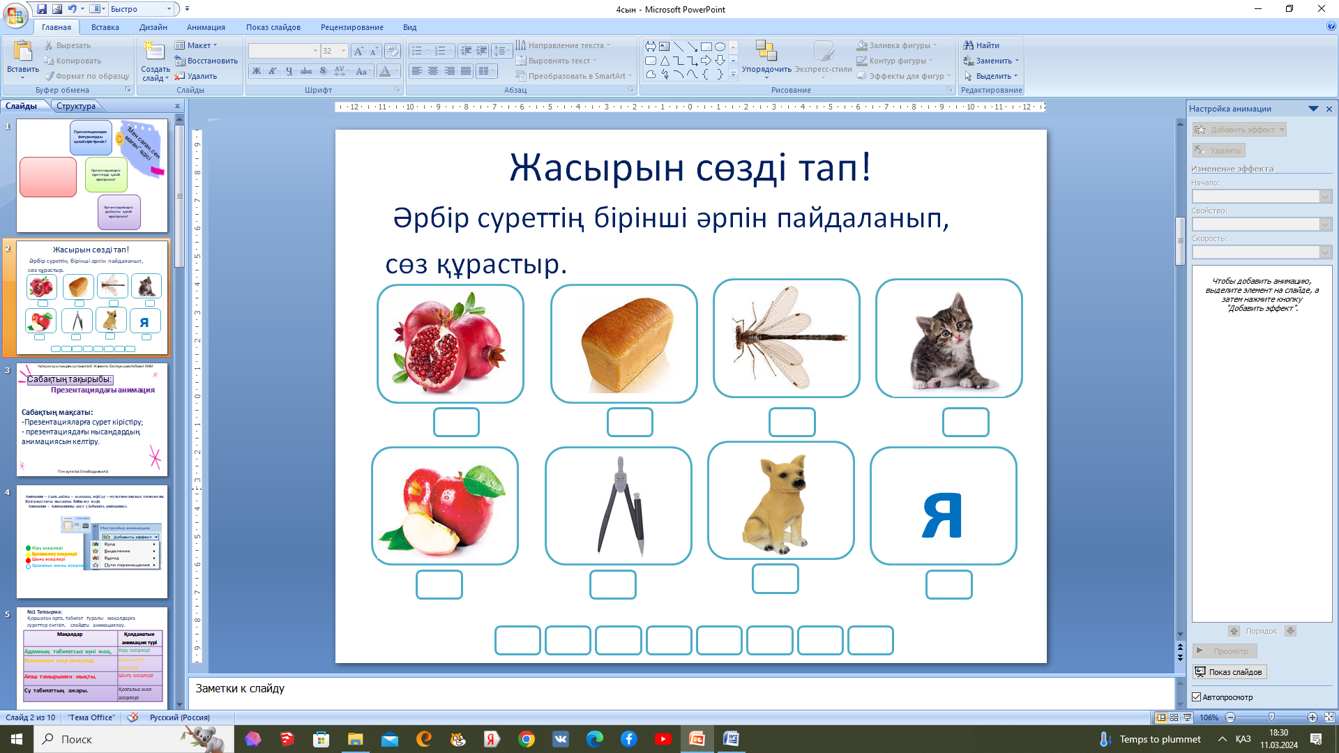 Ұйымдaстыpy кезеңi. 1. Сәлемдесy.Түгендеy. 2. Сaбaққa зейiндеpiн ayдapy. Өткен сабақты сұрау мақсатында «Мен саған, сен маған» әдісі 1. Презентациядағы суретті қалай кірістіреміз? 2. Презентациядағы дыбысты қалай кірістіреміз? 3. Презентациядағы видеоны қалай кірістіреміз? 4.Слайдқа қандай нысандарды орналастыра аламыз? 5.Презентацияға слайд қосу үшін қандай команданы орындаймыз? 6.Слайдтарды қалай сақтауға болады? 7.Слайдтағы шаблон деген не? Жаңа сабақтың тақырыбын ашу мақсатында Жасырын сөзді тап! Әрбір суреттің бірінші әрпін пайдаланып, сөз құрастыр.
