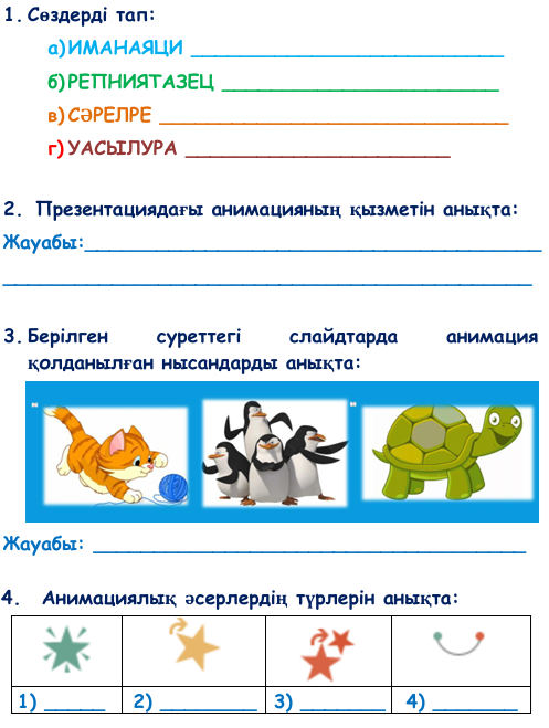- Біздің сабағымыздың тақырыбы қандай деп ойлайсыз? - Оның мақсаттары қандай? - Біздің алдымызда қандай міндеттер тұр? Оқушылар сұрақтарға жауап беріп, топтық талқылау өткізгеннен кейін мұғалім сабақ тақырыбымен таныстырады. Топтық жұмыс. Оқушыларды 2 топқа бөлу. I-Анимация ІІ - Презентация тобы. Тапсырма: Қағазға аттың анимациялық суретін салыңыз. Анимацияны қолмен бейнелеуде қандай қиындықтарға тап болдыңыз? Топ мүшелерімен ой бөлісіңіз. Білімді бекіту
