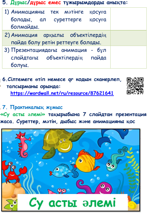 Оқушылар нысандардың анимациясын презентацияға енгізуді үйренеді |