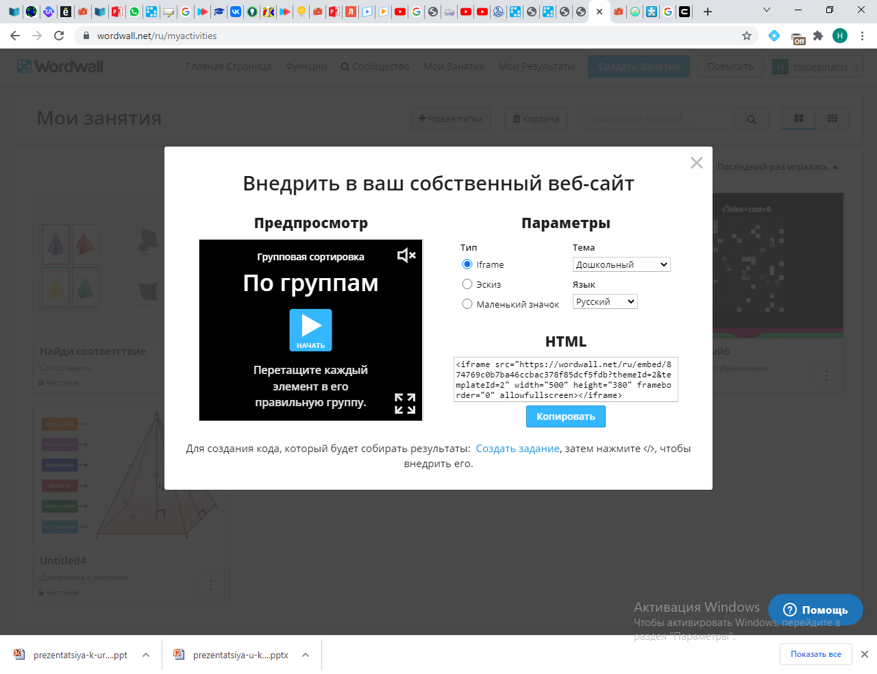Занятия Wordwall можно разместить на другом веб-сайте, используя фрагмент HTML-кода. Это работает так же, как функция вставки видео, которую можно найти на YouTube или Vimeo, что дает вам воспроизводимое занятие на вашем собственном сайте.