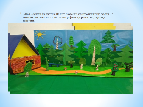 Воспитатель. Итак, все готово! Молодцы, ребята! Мы с вами превратились в самых настоящих мультипликаторов. Посмотрите какие красивые, яркие декорации у нас получились. Давайте приступим к съемке мультфильма. Помогите мне разложить на фоне машинки, светофор и нашего человечка.