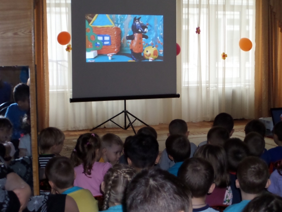 (родители и дети присаживаются на стульчики перед экраном для просмотра видео ролика)
