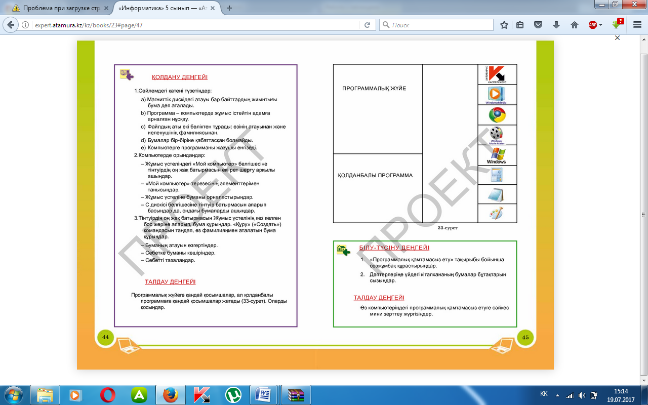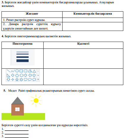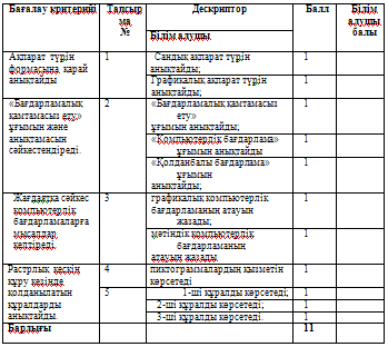 5.1.2.1 «программалық қамтамасыз ету» ұғымын түсіндіру 5.2.1.1 Әр түрлі формада ақпаратты атап шығу және көрсету 5.1.2.1 «Бағдарламалық қамтамасыз ету» ұғымын түсіндіру 5.2.2.2 Растрлық кескіндерді жасау және өңдеу |