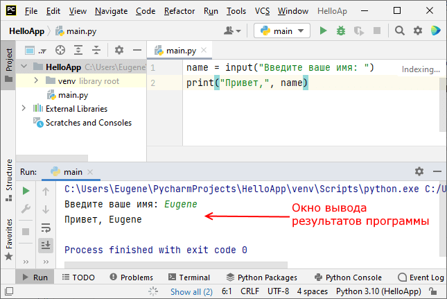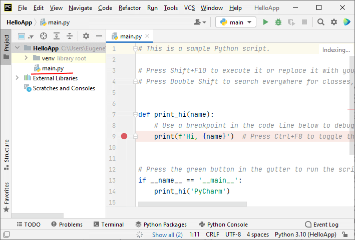 Енді ең қарапайым бағдарламаны құрайық. Ол үшін main.py файлының кодын келесідей өзгертейік: