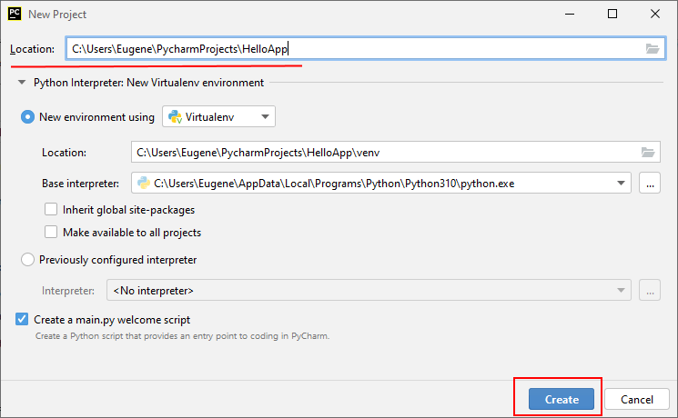 Шындығында PyCharm ең қарапайым қосымшасы үшін интерпретатордың қалай орнатылатындығы маңызды емес. Алайда, бұл жағдайда біз келісім бойынша таңдалған «New Environment Using» құсбелгісінен шығамыз және оның астында «Base Interpreter» өрісінде аудармашы файлына жолды көрсетіңіз, оны орнату бірінші тақырыпта қарастырылды.
