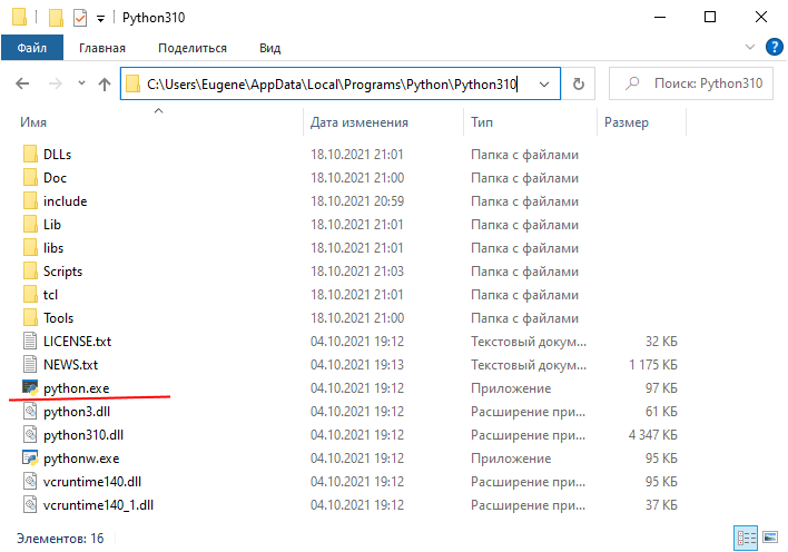 Жоғарыда айтылғандай, егер орнату кезінде мекен-жайы өзгертілмесе, келісім бойынша инетрпретатор бағдарламасы Linux-те usr/local/bin/python39 жолымен, ал Windows-та C:\Users\[пайдаланушы аты-жөні]\AppData\Local\Programs\Python\Python39\ және python.exe деп аталатын файлда сақталады.