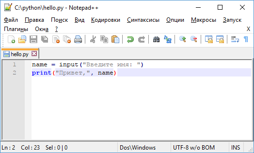 Негізінде, бағдарламалар сыртқы сценарий(скрипт) файлдарында сақталады, содан кейін орындалу үшін интерпретаторға беріледі. Сонымен, бағдарлама файлын құрайық. Ол үшін С диск жетегінде немесе файлдық жүйенің басқа жерінде сценарийлер үшін python қалтасын құрамыз. Бұл қалтада hello.py деп аталатын жаңа мәтіндік файл жасаңыз. Әдетте, Python коды бар файлдарда py кеңейтілімі болады.