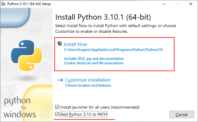 Бірақ егер орнату кезінде «Python 3.9-ді PATH-ке қосу» параметрі көрсетілген болса, яғни Python интерпретаторына жол қоршаған ортаның айнымалыларына қосылса, онда аудармашының толық жолының орнына жай ғана python жазуға болады: