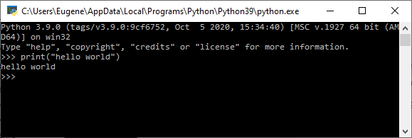Мұнда Python 3.9 (64-биттік) утилитасы біз сценарийді басқара алатын интерпретаторды ұсынады. Файлдық жүйеде интерпретатордың файлын өзі орнатылған жол бойынша табуға болады. Windows жүйесінде әдепкі жол C:\Users\[username]\AppData\Local\Programs\Python\Python37 болып табылады, ал интерпретатор дегеніміз python.exe файлы болып табылады. Linux ОЖ-де орнату /usr/local/bin/python3.9 жолы бойынша орындалады.