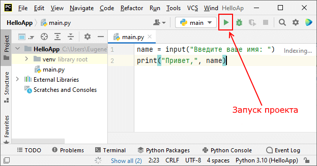 Сондай-ақ, бастау үшін, Run мәзіріне өтіп, Run 'main' батырмасын басуға болады.