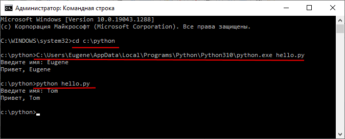 Енді командалық жолды немесе терминалды іске қосып, hello.py бастапқы код файлы орналасқан қалтаға өту үшін cd пәрменін қолданайық (мысалы, менің жағдайда бұл C:\python қалтасы). Келесіде, алдымен интерпретатордың толық жолын, сосын сценарий файлының толық жолын енгізіңіз: