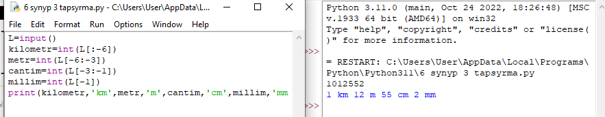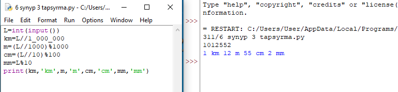 2 тапсырма** Қзындығы L миллиметрде берілген. Берілген ұзындықты километр, метр, сантиметр және миллиметрде өрнектейтін программа жаз.