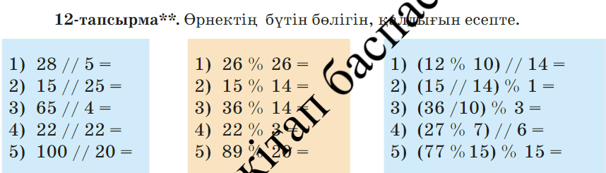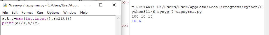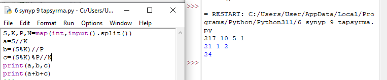2 тапсырма*** Айдын, Санжар және Асқар үшеуі балық аулауға барды. Балалар сәйкесінше саны k, l және m болатын балықтар аулады. Достар аулаған балықтарын тең бөліп алса, оларға неше балықтан тиеді? Неше балық қалады? Программа құр.