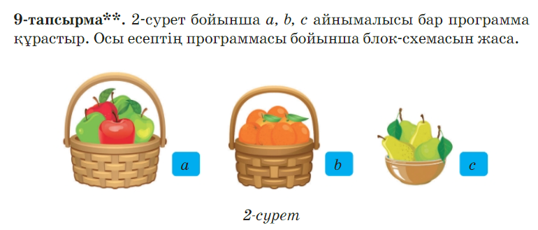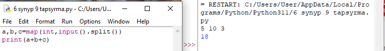 2 тапсырма** a, b, c бүтін сандары берілген. Осы сандардың қосындысы мен көбейтіндісінің соңғы цифрларының қосындысын экранға шығар.