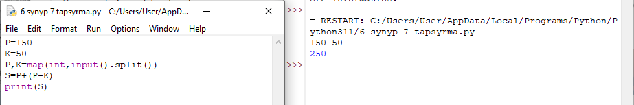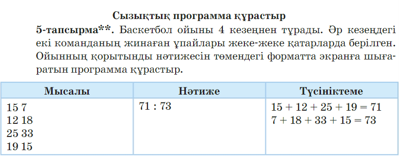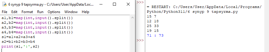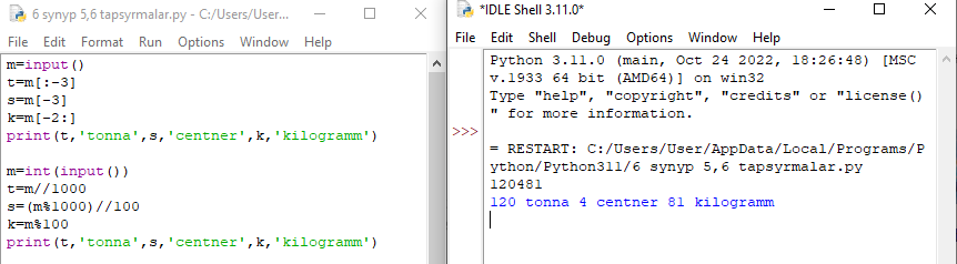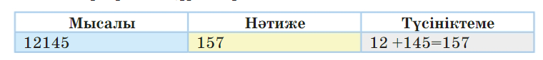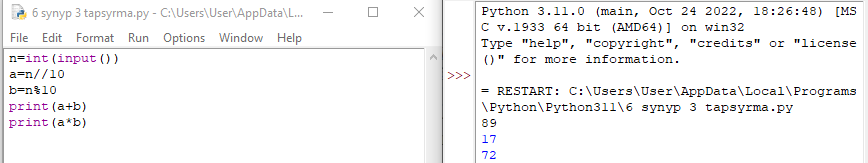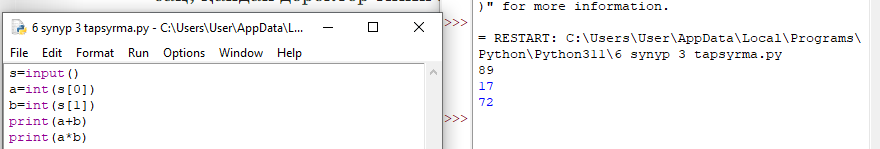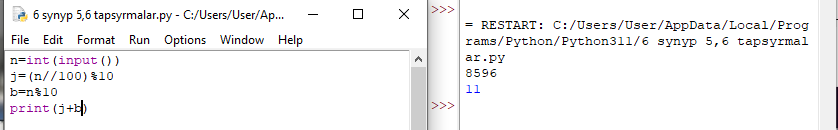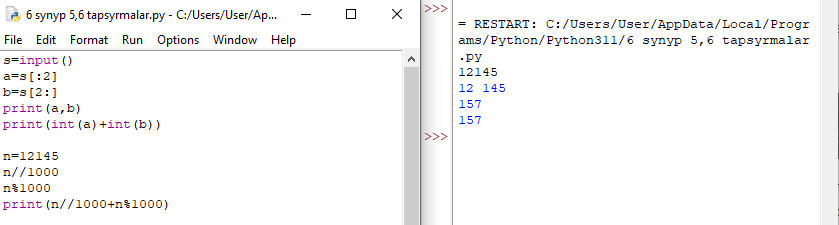 7 тапсырма*** Бес таңбалы санның алғашқы екі цифрынан құралған сан мен соңғы үш цифрынан құралған санның қосындысын табатын программа құрастыр.
