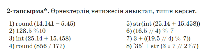 1 тапсырма* Берілген айнымалыларға type() функциясын қолдансаң, қандай деректер типін аласың.