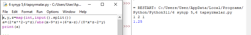 8 тапсырма* x, y және z айнымалылары бар өрнек берілген. Айнымалылардың кез келген мәндеріне осы өрнектің мәнін есептейтін программа құрастыр.