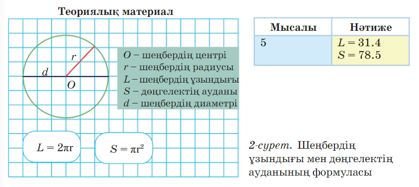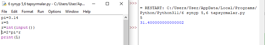 5 тапсырма* Шеңбердің радиусы берілген. Радиусты пайдаланып, шеңбердің ұзындығы (L) мен дөңгелектің ауданын (S) табатын программа кодын құрастыр. Бұл жерде π=3.14