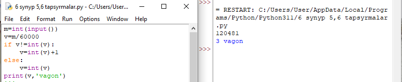 ә) Егер жүк тасмалдайтын 1 темір жол вагонына 60 тонна бидай сыятыны белгілі болса, бидай экспорты үшін неше вагон қажет екенін табатын программа құрастыр.
