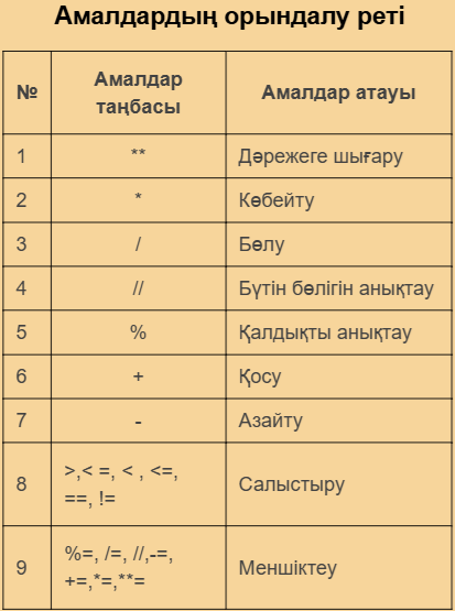 1. Python тілінде арифметикалық әрекеттерді қолдану арқылы өрнектерді жазады. 2. Python функциясының атқаратын қызметін біледі 3.Амалдардың орындалу ретін анықтайды. |