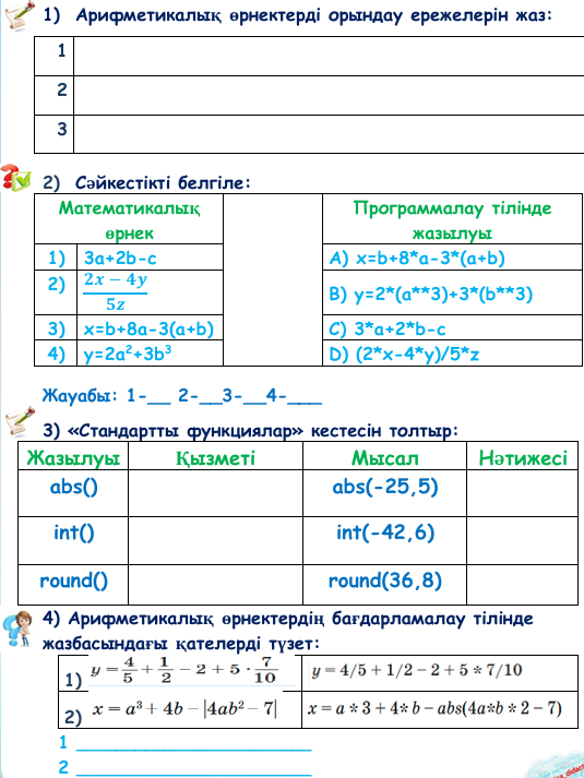 Мұғалімнің ақпаратын тыңдайды, мысалдарды талдайды Тапсырманы орындайды, шыққан нәтижеге талдау жасайды Дескрипторлар: - ережелердің жазады - сәйкестікті белгілейді - кестені толтырады - бағдарлама кодын түзетеді Көз жаттығуларын орындайды - өрнектерді программалау тіліне аударып жазады; - бағдарламадағы бос орындарды толтырады;