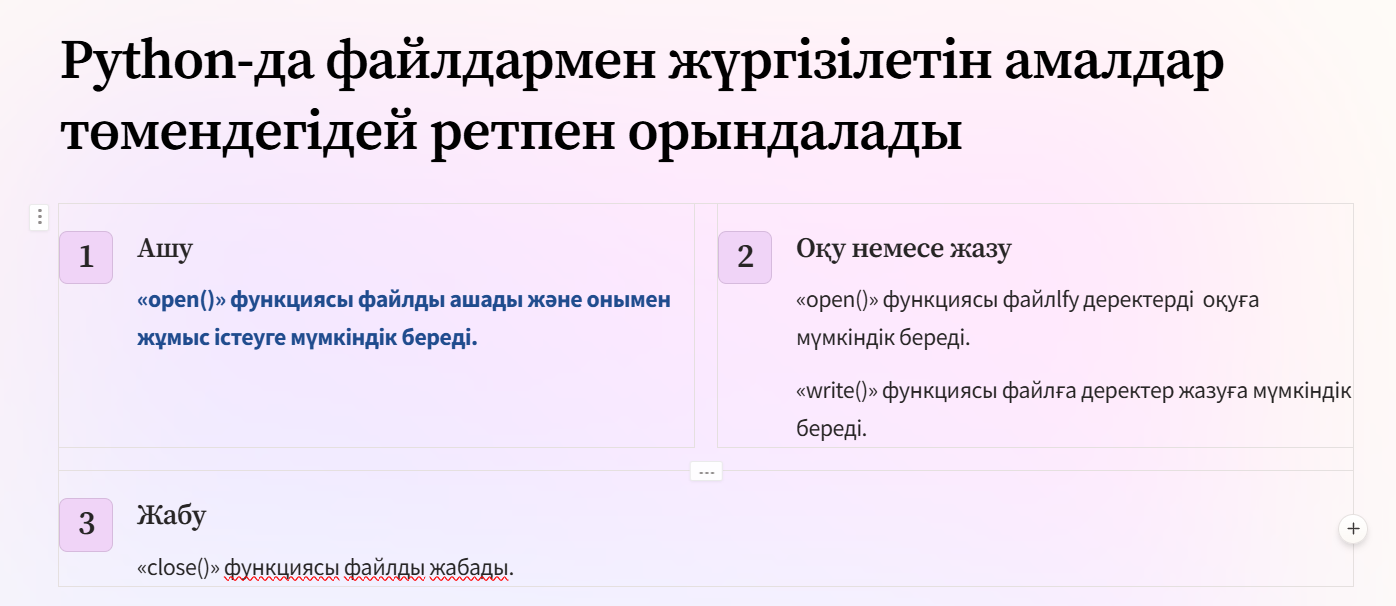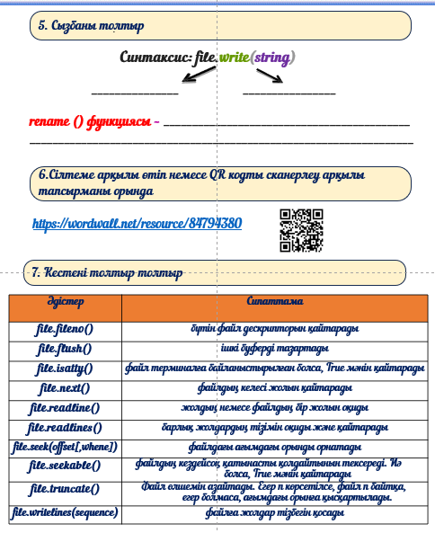 Python бағдарламалау тілінде файлды қалай ашуға және жабуға болатындығын біледі; Python бағдарламалау тілінде файлдарды қалай оқуға және жазуға болатындығын біледі |