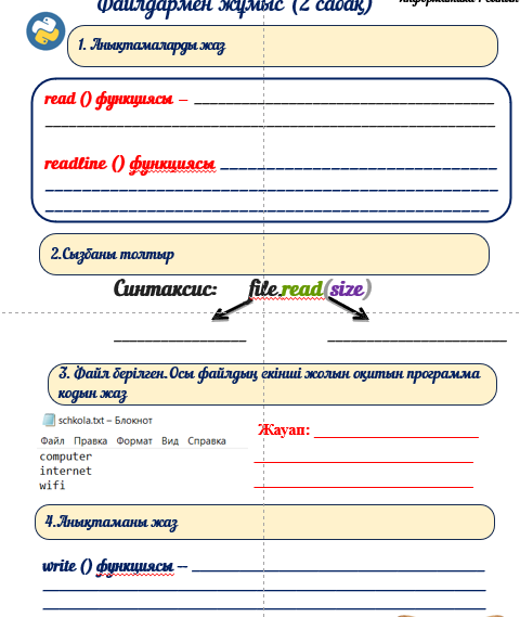 7.3.3.1 Python (пайтон)программалау тілінде файлды оқу және жазу; |