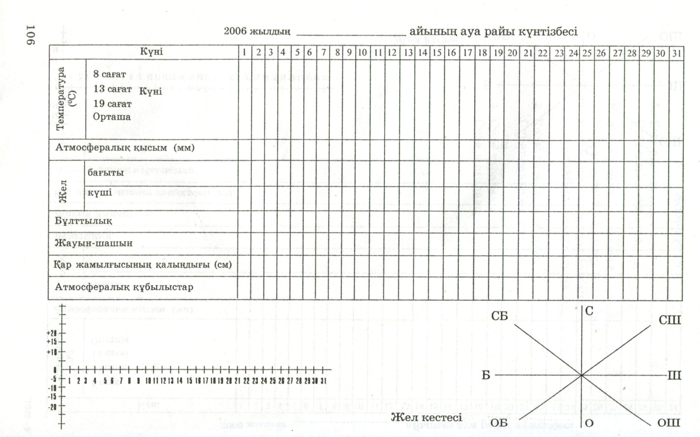 6.Табиғаттағы өзгерістерді бақылау.а) Жинаған мәліметтерің бойынша кестені толтырыңдар. (мұндай кестені ай сайын толтырып отырыңдар.)