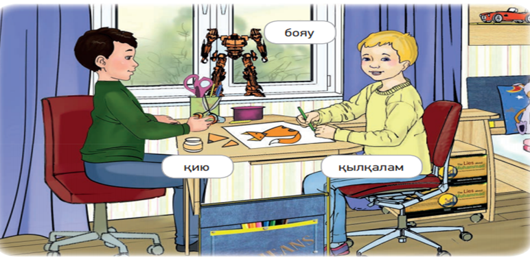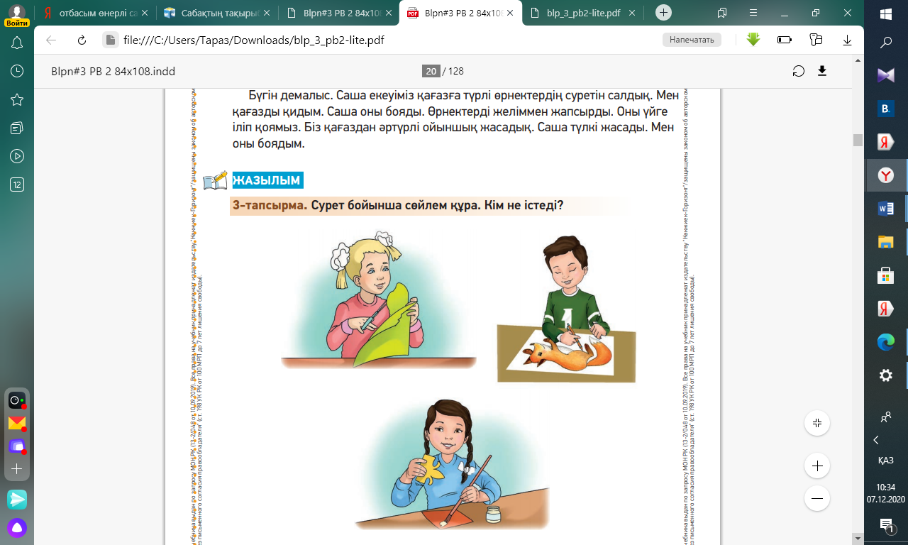 2-тапсырма. Оқылым. Мәтінді оқы. Мәтіннен жіктік жалғауы бар сөйлемдерді тап. Бүгін демалыс. Саша екеуіміз қағазға түрлі өрнектердің суретін салдық. Мен қағазды қидым. Саша оны бояды. Өрнектерді желіммен жапсырды. Оны үйге іліп қоямыз. Біз қағаздан әртүрлі ойыншық жасадық. Саша түлкі жасады. Мен оны боядым. Дескрипторы: . мәтінді мәнерлеп, түсініп оқиды; . мәтіннен жіктік жалғауы бар сөйлемдерді табады.