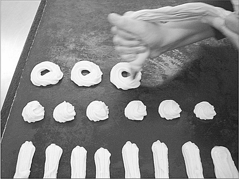 Фор м а ла у (6.22 сур): қамырды кесік тілігі бар кондитерлік қапшықтың көмегімен таяқша, дөңгелек, сақина сияқты етіп, аздап майланған кондитерлік ыдыста формалайды.