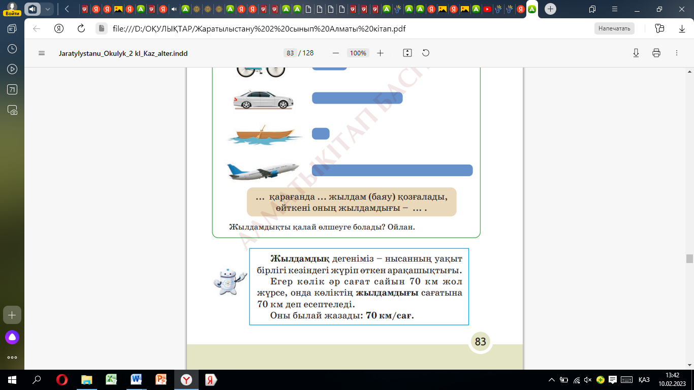 Үй тапсырмасын тексеру Түрлі дереккөздерді пайдаланып, кемені қалай жасайтынын жаз. «Ой қозғау» әдісі Өрнектердің мәнін кему ретімен орналастыр. Сонда сен сабақтың тақырыбын білесің. Сабақтың тақырыбы мен мақсатын хабарлау 1-тапсырм Ұжымдық жұмыс «Серпілген сауал» әдісі Суретке қара. Мәреге қайсысы бірінші болып келеді? Неліктен? «Мен зерттеушімін» әдісі Жылдамдықты сипаттау үшін қай сөздерді қолданасың? Белгіле ЕББҚ Тапсырманы орындауда қолдау көрсету Талқылау сұрақтары: Жылдамдықты немен өлшейді? |