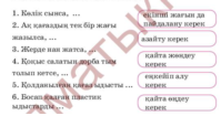 4.3.4.1 мұғалімнің қолдауымен мәтін мазмұнын және кейіпкерлердің іс-әрекетін бағалауға бағытталған сұрақтар (неліктен? не үшін?) құрастыру және оған жауап беру 4.5.1.4 белгісіздік мағынаны білдіретін сөздердің жазылуын үйренеді |