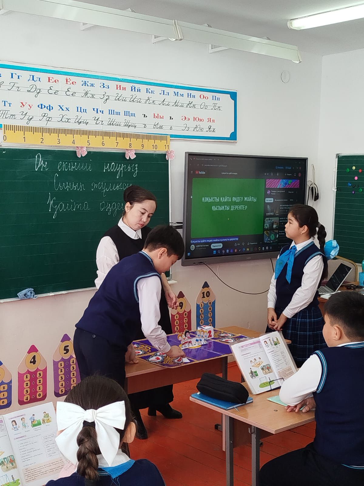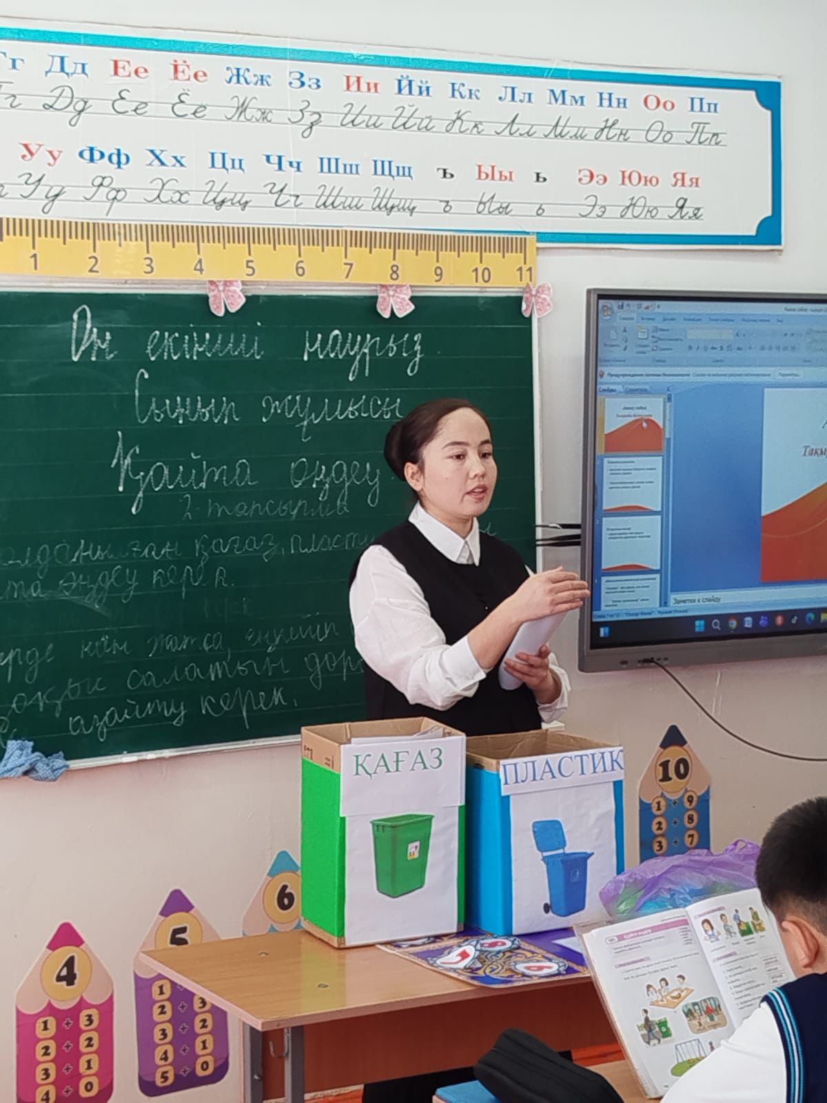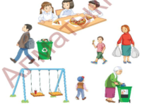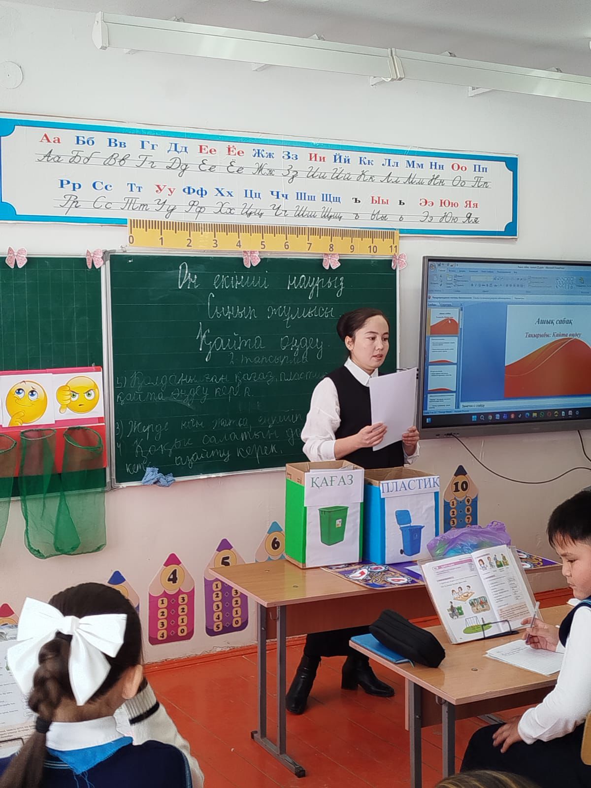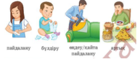 Ә) Сөйлем құрап жаз. Үлгі: Менің ойымша, тамақты артық алу дұрыс емес. Өйткені тамақ қоқысқа тасталады. Қысқасы, тәрелкедегі тамақты азайту керек. Менің ойымша, қағазды көп қимау керек. Өйткені қағаз қоқысқа тасталады. Қысқасы, қағазды қайта өңдеу керек. Сергіту сәтін орындайды. «Кімтапқыр» ойыны. Мақсаты: Оқушылардың шапшаң, жылдам қозғалып, есту қабілеттерін, бірін - бірі сезу қабілетерін дамыту. Жүргізілуі: қоқыстарды бөліп арнайы жәшігіне салады Оқылым