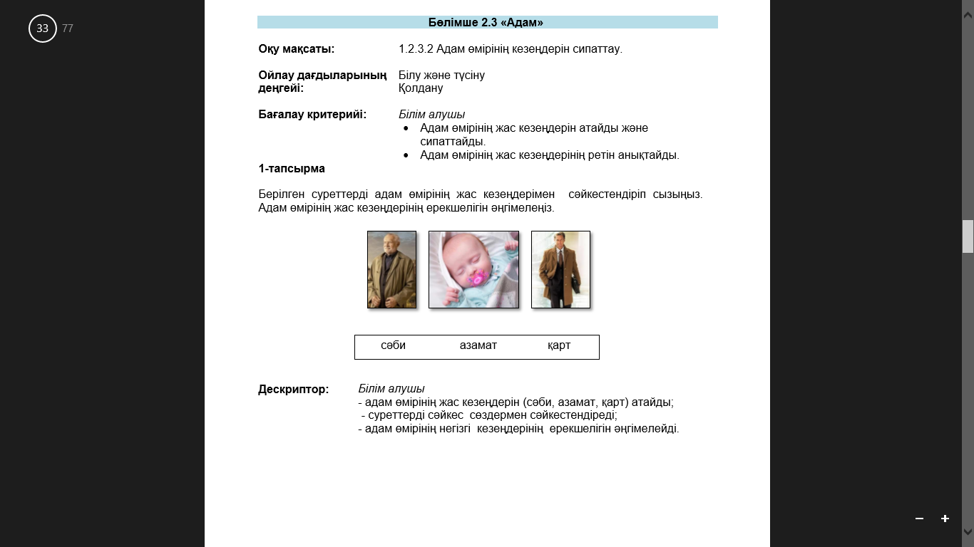 Берілген суреттерді адам өмірінің жас кезеңдерімен сәйкестендіріп сызыңыз. Адам өмірінің жас кезеңдерінің ерекшелігін әңгімелеңіз 2-тапсырма Кішкентай кезіңізден есіңізде қалған оқиғаны баяндап беріңіз 3-тапсырма Берілген суреттерді адам өмірінің жас кезеңдерімен сәйкестендіріп сызыңыз. Адам өмірінің жас кезеңдерінің ерекшелігін әңгімелеңіз.