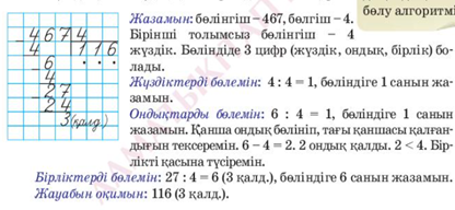 3.1.2.10 мынадай жағдайларда: 23∙2, 123∙2, 46:2, 246:2 екі таңбалы/үш таңбалы сандарды бір таңбалы санға жазбаша көбейту мен бөлу алгоритмдерін қолдану |