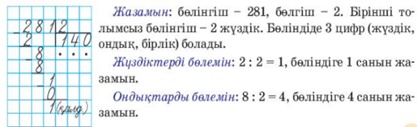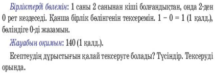 -сандарды жазбаша бөлу алгоритмін қолданады - есептеу кезінде жауабын алдын ала болжайды, нәтижесін құрама есептің шартына сәйкес түсіндіреді |