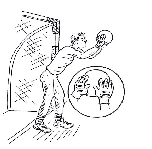 Аяқтары қосылып, тік немесе шамалы бүгіліп тұруы керек. Түйісу сәтінде доп алақанмен астыңғы жағынан қағып алынады да, ішке қарай тартылады (25-сур.). Егер доп қақпашының бүйір жағынан бір қадам жерде домалап келе жатса, ол доп жақтағы аяғымен допқа қарай қадам жасай отырып, бір мезгілде допқа қарай еңкейеді және допқа қол тигізбестен бұрын-ақ келесі аяғына қосады. Сенімдірек болу үшін домалап келе жатқан допты ұстауды қақпашыға бір тізе қалпында жүзеге асыру ұсынылады. Доп жақындап келе жатқанда қақпашы денесінің салмағын тізе буыны қатты бүгілген тірек аяғына ауыстырады. Басқа аяғы сыртқа қарай бұрылады да, тірек аяқтың тізесіне келіп қосылады. Қақпашының төмен түсірілген қолдары сандары үстіндегі бетке түйісіп тұрады. Сандарымен түйіскен доп, білектерімен жоғары қарай домалап, қақпашының ішіне немесе кеудесіне тіреледі. Үлгі жаттығулар