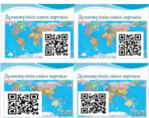 ЖИ әдісімен жасалған дүниежүзі картасының артында тұрған QR кодты сканерлейді берілген сұрақтарға жауап береді. |