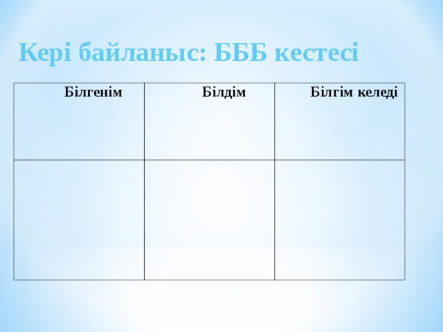 «БББ» әдісі бойынша оқушылармен кері байланыс орнату.(Оқушылардың алдына парақ таратамын.)