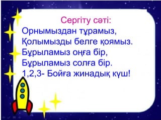Орнымыздан тұрамыз Қолымызды белге қоямыз. Бұрыламыз оңға бір, Бұрыламыз солға бір 1,2,3-бойға жинап күш