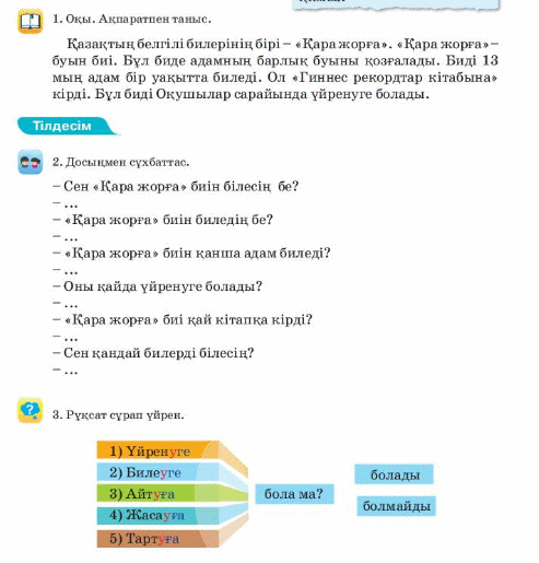Ұсынылған суреттер бойынша болжам жасайды. Мәтіннен негізгі және қосымша ақпаратты анықтайды. Зат есімді тауып, түрлерін ажыратады. Өз қиялынан ертегі құрастырады. |